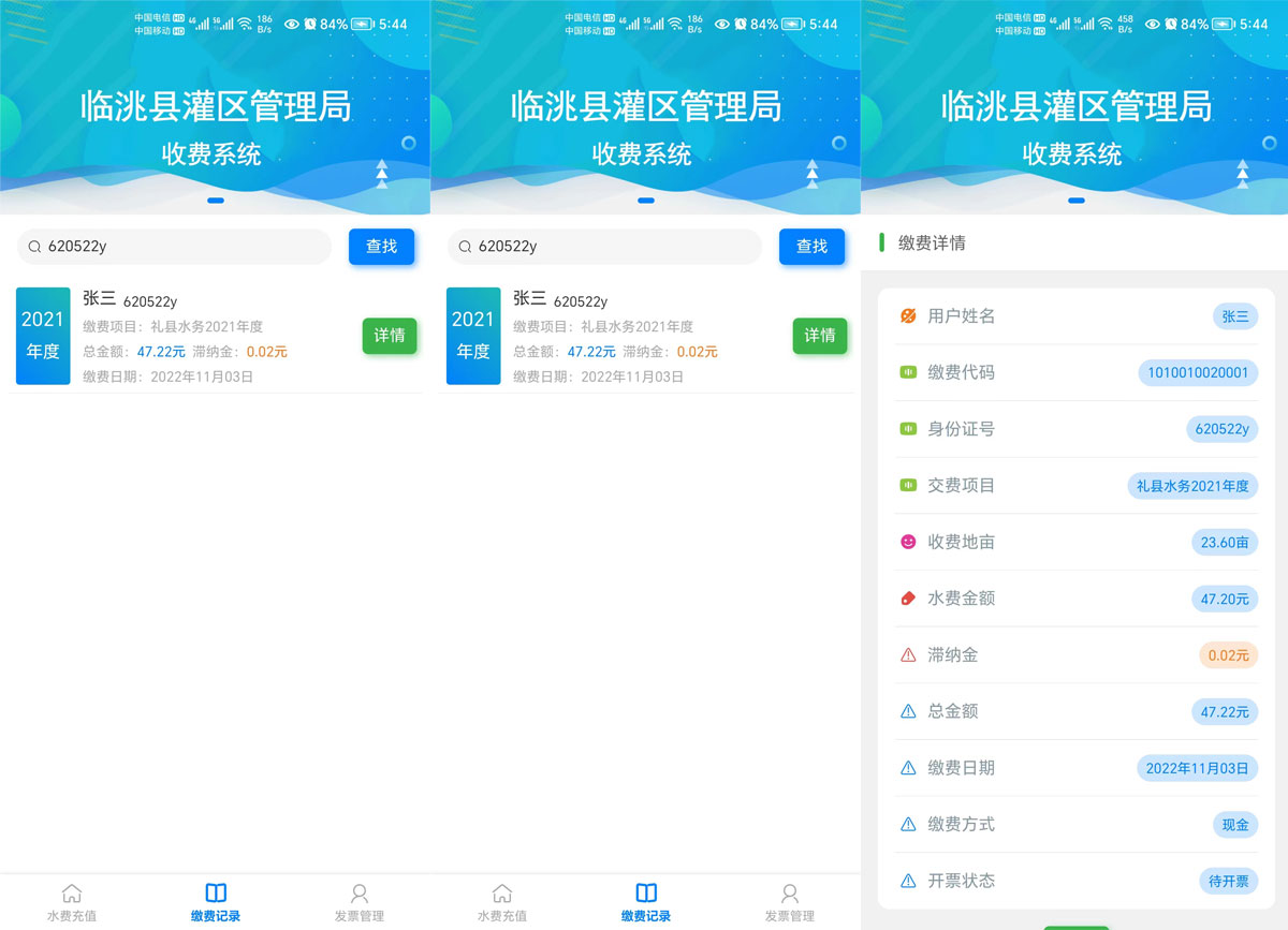 灌區(qū)收費(fèi)系統(tǒng)運(yùn)用計(jì)算機(jī)應(yīng)用技術(shù)以及相關(guān)的專用分析軟件和通訊網(wǎng)絡(luò)所組成的一個(gè)綜合性的收費(fèi)系統(tǒng)。通過(guò)對(duì)流經(jīng)用水戶的灌溉 時(shí)間以及流量的輸入,計(jì)算出該用水戶的水費(fèi),生成收費(fèi)賬單提交至上級(jí)審核 ,審核通過(guò)即可在線繳費(fèi)以及他人代繳功能。管理單位可以在手機(jī)和電腦網(wǎng)頁(yè)上同步查詢相應(yīng)的用水量以及繳費(fèi)情況。